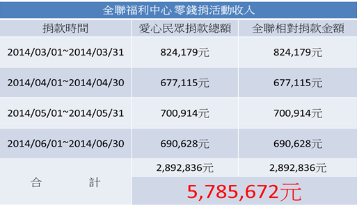 「愛‧從1開始」零錢捐 贈予勵馨基金會2014年3月至6月捐款金額