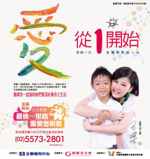 全聯福利中心自3/1到6/30期間,「愛,從1開始」公益活動將支持勵馨基金會「受暴婦幼生活重建最後一里路」計畫,期待與社會各善心民眾一同將零錢化為大大的力量,讓受暴婦女在住宅、就業、關係重建等問題上能得到適當的協助,透過勵馨基金會的專業輔導與支持讓她們得以不再依賴社會福利,反成為有產值,可以賺錢養家的人。