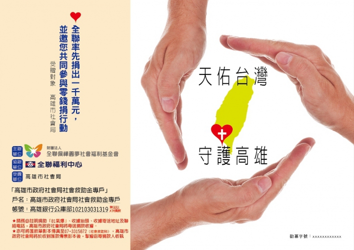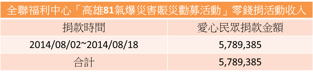 因應高雄81氣爆事件,本會於8/2起即申請「高雄81氣爆災害賑災勸募活動」專案,結合母企業全聯福利中心通路優勢,以最簡單、便民的方式,立即啟動全台700多家門市、2,000多個零錢捐款箱為愛心募資平台;截至8/18止募款金額共計5,789,385元,小小零錢箱,讓您的愛心聚沙成塔,所有款項於9/3全數捐贈予「高雄市政府社會局社會救助金專戶(81氣爆)」,為後續災後重建共盡心力。