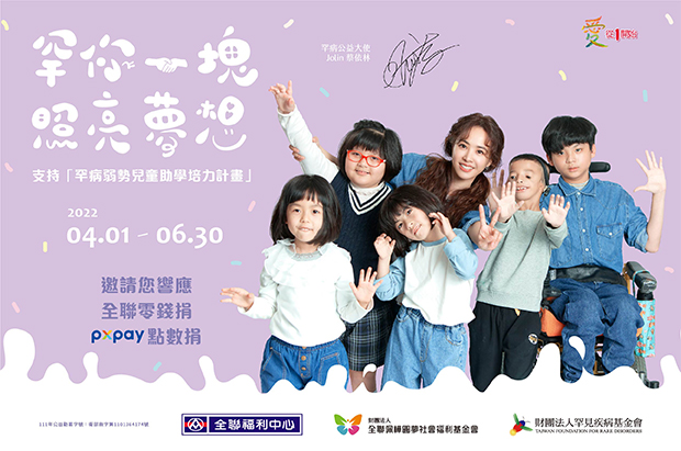 4/1至6/30,罕病公益大使蔡依林誠摯邀請您至全聯福利中心,投下手邊零錢或捐出PX Pay福利點數,支持「罕見疾病弱勢兒少助學培力計畫」,陪伴罕病兒童快樂學習,大步邁前。