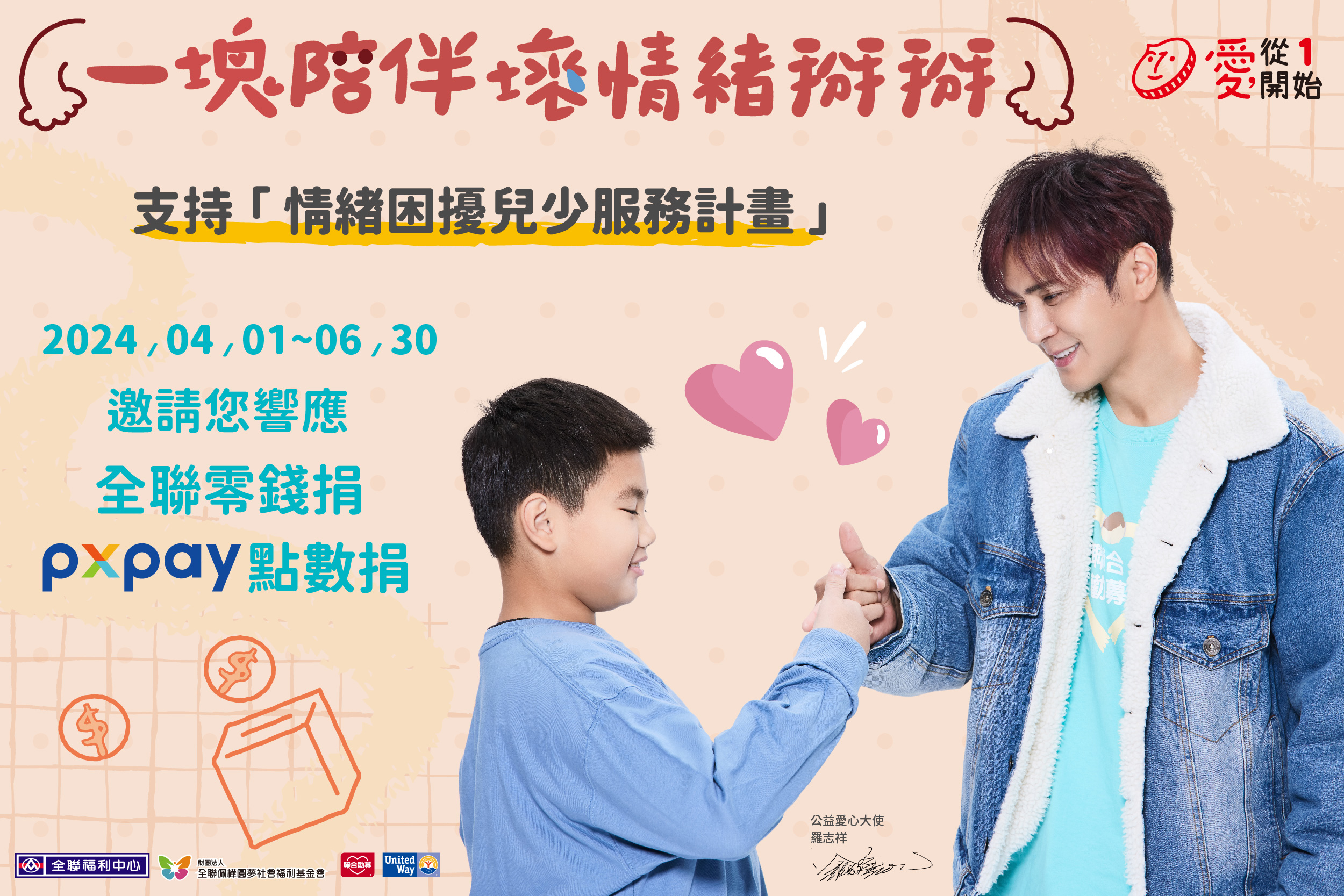 4/1至6/30公益愛心大使羅志祥邀請您到全台全聯門市投入零錢或透過手機捐出福利點數,支持聯合勸募「情緒困擾兒少服務計畫」,引導孩子做情緒的主人。