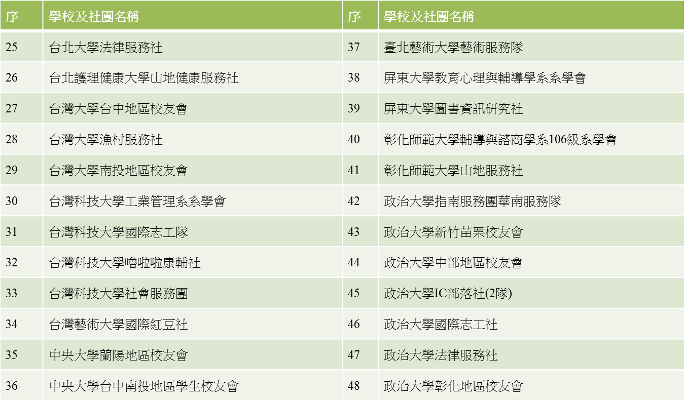 本會「大專院校服務性社團寒假營隊」補助計畫,徵件期間收到各校青年學子的踴躍參與,本會以活動企劃書之完整性、服務方案豐富性和延續性,以及是否能結合學生所學專長,為此次審核的方向;105年寒假偕同中央大學、台北醫學大學、南臺科技大學…等26校所大專院校,總計93個社團、共3,203位青年志工參與,一共服務了10,288位的偏鄉學童,入選社團如下。