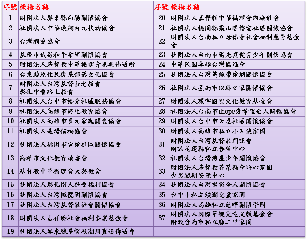 本會公告 全聯幸福手推車計畫 2017-07-01 106年度下半年『幸福手推車計畫』入選公告 本會幸福手推車計畫是針對坊間社福機構所開設之課輔班,提供其一般課後或寒暑假的餐點物資,讓弱勢家庭的學童們除了食用學校供應的營養午餐之外,仍能免於營養匱乏、開心學習。本梯次手推車計畫共收到38間機構申請,入選37間機構,預計1476名弱勢兒少將受惠,其中包含29案為兒少弱勢課輔班營養物資需求、8案為安置機構的申請,入選機構請見下表。 上一則 回總覽 下一則