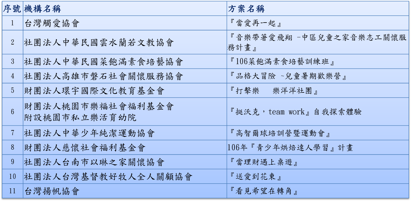 本會公告 少年福利 2017-07-01 106年夢想啟程第二梯次入選公告 夢想培力計畫宗旨為藉由結合社福團體之創意,提供弱勢兒童及少年所需之關懷照顧,以及激發其探索自我的潛能,同時要求增加兒少參與社會服務,盼從中建立關懷與尊重他人之態度。本梯次夢想啟程計畫-培力方案類共收到14件提案,入選11件提案,預計342名弱勢兒少(不含講堂)將受惠,其中包含7件多元學習、4件成長團體的申請,入選機構請見下表。 上一則 回總覽 下一則