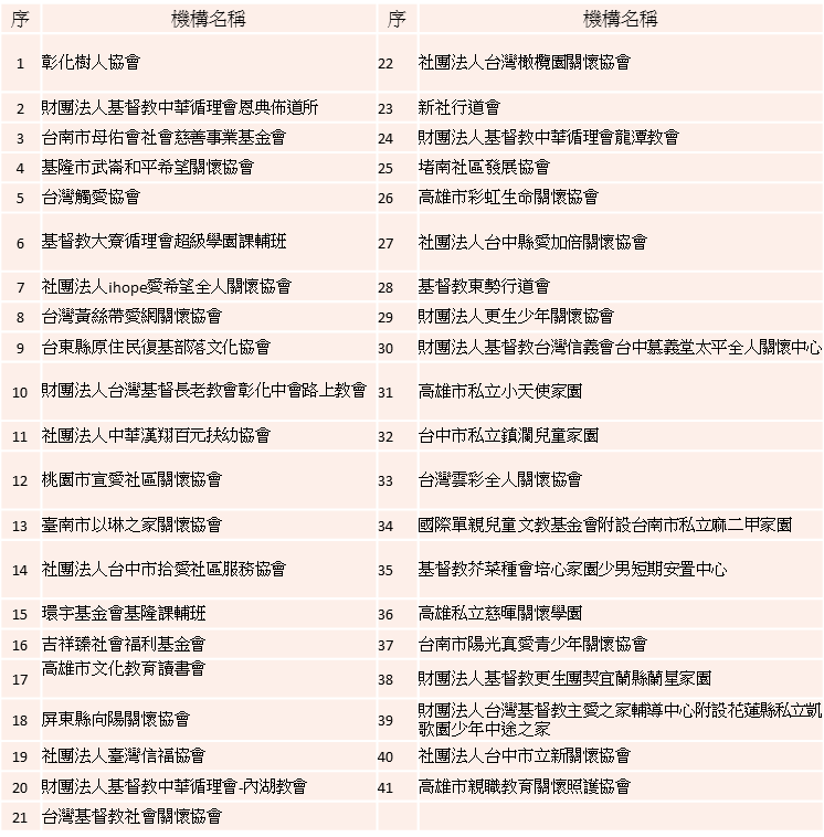 本會公告 全聯幸福手推車計畫 2018-01-01 107年度上半年『幸福手推車計畫』入選公告 本會幸福手推車計畫是針對坊間社福機構所開設之課輔班,提供其一般課後或寒暑假的餐點物資,讓弱勢家庭的學童們除了食用學校供應的營養午餐之外,仍能免於營養匱乏、開心學習。本梯次手推車計畫共收到43間機構申請,入選41間機構,預計1616名弱勢兒少將受惠,其中包含30案為兒少弱勢課輔班營養物資需求,9案為兒少安置機構生活物資申請,2案為兒少師資經費補助申請。入選機構請見下表。 上一則 回總覽 下一則