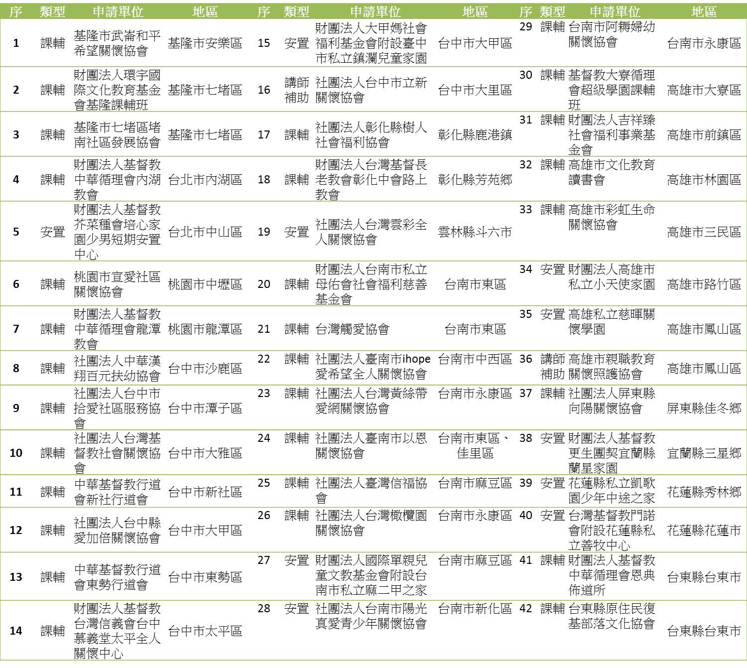 107年下半年手推車計畫共收到52間機構申請,入選42間機構,預計1,719名弱勢兒少將受惠,其中包含31案為兒少弱勢課輔班營養物資需求,9案為兒少安置機構生活物資申請,2案為兒少師資經費補助申請,入選機構請見下表。