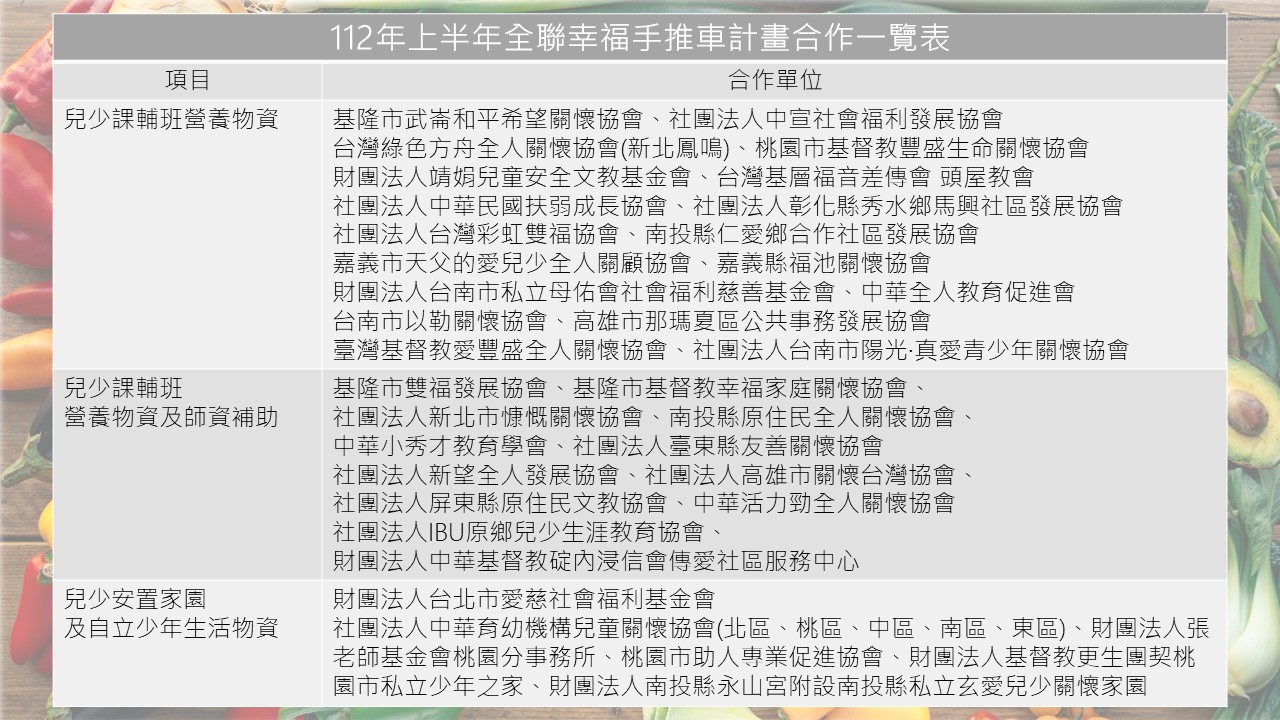 本會公告 全聯幸福手推車計畫 2022-12-29 【長期助養─幸福手推車計畫】112年度上半年合作入選公告 生活中處處都是學問,全聯以打造「公益賣場」為目標,全聯佩樺基金會結合母企業推出「全聯幸福手推車計畫」,長期以全聯公益福利卡儲值金及贊助師資鐘點費用,觀察到弱勢家庭小朋友較缺乏生活經驗,透過與社福課輔班的合作,幫助學童重拾自信,也讓兒少從中獲得生活啟發。 上一則 回總覽 下一則